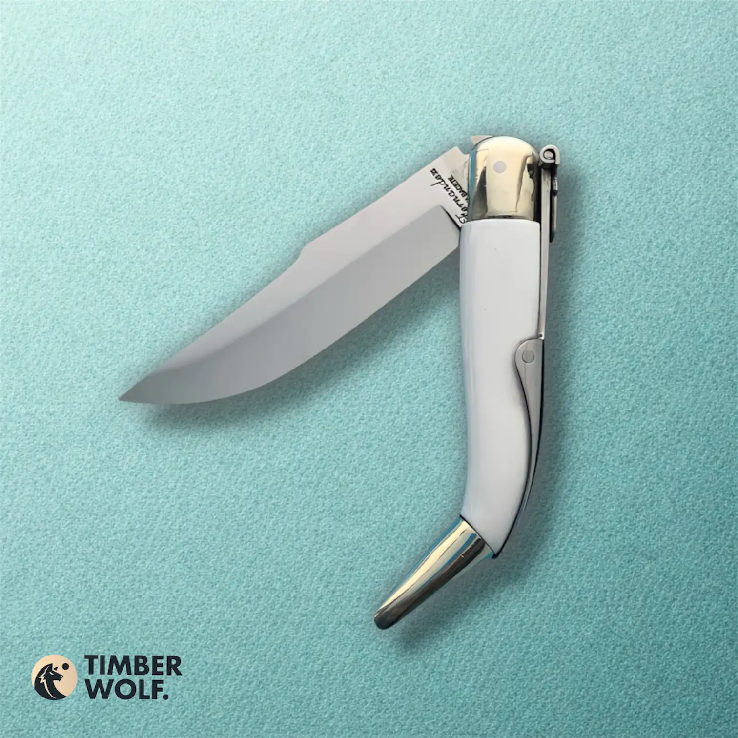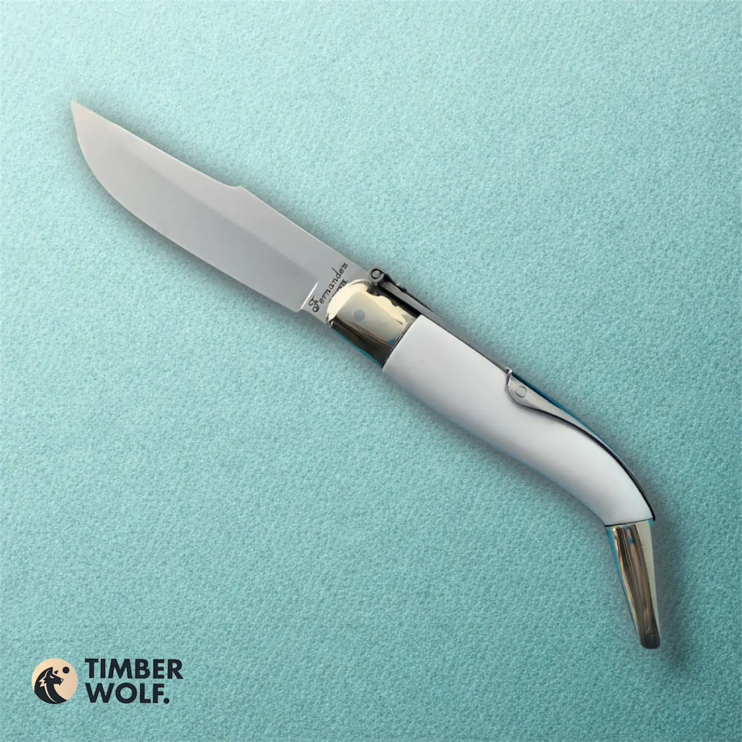 Navaja Clásica de Albacete elaborada con empuñadura en Krión Blanco y hoja en Acero 440-C. Presenta virolas de alpaca y sistema de cierre mediante palanquilla.