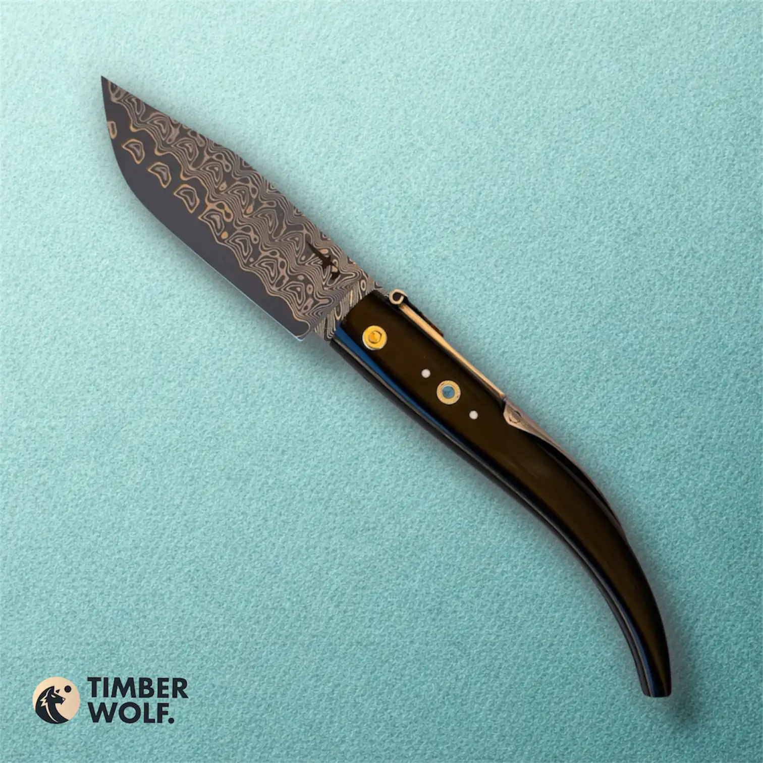 Navaja Pastora elaborada con empuñadura en Cuerno de Búfalo y hoja en Acero Damasco. Presenta virolas de acero y sistema de cierre mediante palanquilla.